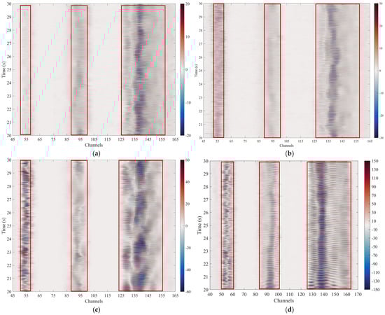 Spiral fiber winding strengthens the phase response of distributed acoustic sensing (DAS) by increasing the strain caused by vibration. At the same time, however, this increase also raises some practical issues, including higher noise sensitivity (Figure 16). Both the signal gain and signal-to-noise ratio (SNR) are trade-offs that limit the scope of its applications, primarily focusing on scenarios dominated by low-amplitude events, such as shallow subsurface imaging or perimeter security monitoring. The amplified signal is used in real applications of real-time anomaly detection workflows. For instance, in pipeline integrity assessment, greater sensitivity enables the earlier detection of microseismic events, which may signify a leak or intrusion. The demodulated phase data can subsequently be processed through a threshold-based algorithm, as also reported in [].
