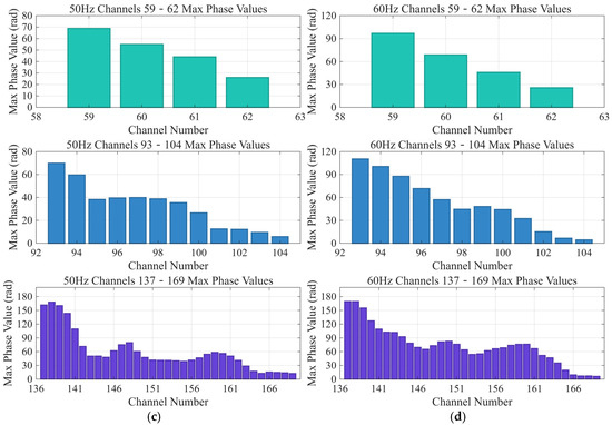 Power Spectral Density (dB/Hz) from 30 Hz to 60 Hz. (a) 30 Hz. (b) 40 Hz. (c) 50 Hz. (d) 60 Hz.