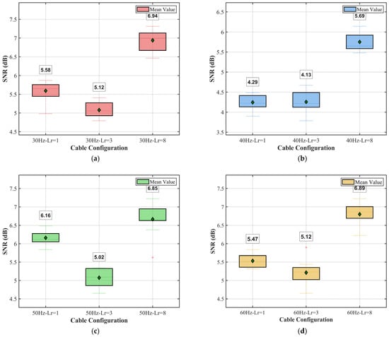 To evaluate the repeatability and stability of the fiber-optic cable sensing system, box plot analyses were conducted for SNR measurements at four different vibration frequencies (30 Hz, 40 Hz, 50 Hz, and 60 Hz). Each frequency condition included three fiber-optic cables (Lr = 1, Lr = 3, and Lr = 8), with 10 repeated measurements for each configuration, to assess measurement consistency. A comprehensive analysis is shown in Figure 19. The signal-to-noise ratio (SNR) in decibels (dB) was calculated using the formula SNR = 10 log10(signal power/noise power).