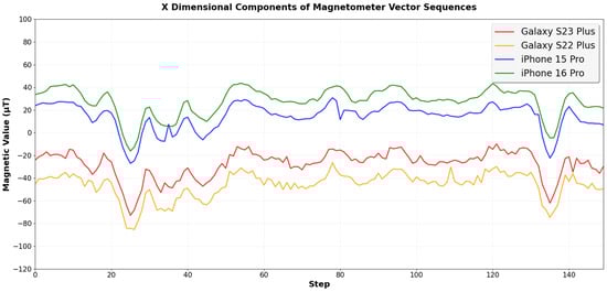 However, in a real-world environment, different smartphone models produce different sensor measurements even under the same conditions. Figure 1 shows the magnetic field vector sequences in the x dimension measured by four different smartphones (Galaxy S23 Plus (Samsung Electronics Co., Ltd., Suwon, Republic of Korea), Galaxy S22 Plus (Samsung Electronics Co., Ltd., Suwon, Republic of Korea), iPhone 15 Pro (Apple Inc., Cupertino, CA, USA), and iPhone 16 Pro (Apple Inc., Cupertino, CA, USA)) along the same 150-step walking path. The magnetic field measurements show a difference of up to 74 µT between the iPhone 16 Pro and the Galaxy S22 Plus.