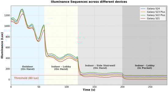 To evaluate our bias normalization algorithm for in-pocket or hand-held state detection, we collected light sensor measurements in the testbed while moving under bright environments (indoor lobby with natural light) and under darker environments (indoor corridors, stairwells). In each test, we held the smartphone in hand in portrait mode for 180 s while walking and then placed it in the front pants pocket. Figure 10a shows the light sensor measurements without bias normalization. When each device is placed in the pocket, different illuminance values are measured due to light sensor offset biases. In the pocket, the Galaxy S23 Plus, Galaxy S22 Plus, Galaxy S24, and Galaxy S21 measured approximately 35 Lux, 78 Lux, 57 Lux, and 16 Lux, respectively. Each smartphone model would require a separate threshold setting for accurate in-pocket detection.