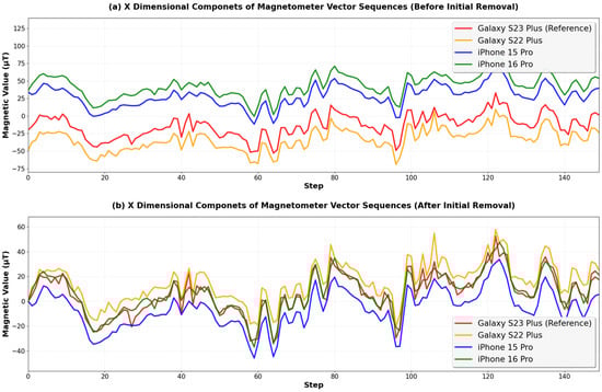 Comparison of magnetic field vector sequences in the x dimension before and after applying the initial value removal algorithm. (a) Original magnetic field vector sequences collected from four different smartphone models along the same 150-step walking path, showing offset biases among the devices. (b) Magnetic field vector sequences after applying the initial value removal algorithm, demonstrating reduced offset biases among the devices.