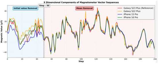 Figure 3 shows the results of applying the initial value removal algorithm to magnetic field vector sequences in the x dimension. Figure 3a shows the sequences from four different smartphone models along the same 150-step walking path. Before applying initial value removal, the offset biases relative to the reference device were 56.47 μT, 41.74 μT, and 19.90 μT for the iPhone 16 Pro, iPhone 15 Pro, and Galaxy S22 Plus, respectively. After the initial value removal, the biases decreased to 3.62 μT, 12.10 μT, and 9.08 μT as shown in Figure 3b.