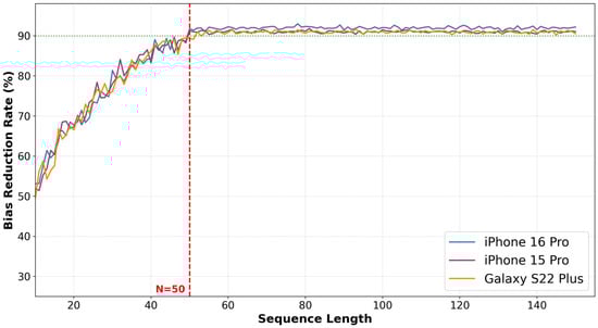 Bias reduction rates as we increase the sequence length for the mean removal algorithm. We use the Galaxy S23 Plus as the reference device and collect the results for three smartphone models (iPhone 16 Pro, iPhone 15 Pro, and Galaxy S22 Plus). The bias reduction rates steadily increase from 50% to 90% as we increase the sequence length from 10 to 50. Beyond a length of 50, the rates saturate and converge to approximately 91 to 92% across all devices. The green dashed line represents the 90% bias reduction threshold, included as a visual reference for the saturation region.