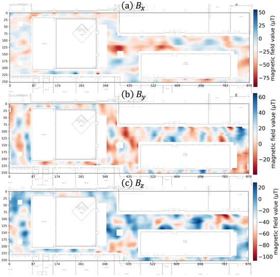 Three-dimensional magnetic field map of the Hana Square testbed. The map shows the collected magnetic field vector components interpolated at 10 cm grid intervals: (a) x dimension (), (b) y dimension (), and (c) z dimension ().