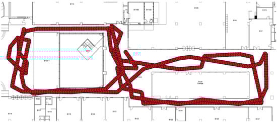 We applied our bias normalization algorithms to our geomagnetic vector-based IPS [,]. We built the IPS in the Hana Square underground facility at Korea University Science Campus, which has an area of 2476 m2 (26 m × 95 m). We collected three-dimensional magnetic field vectors at 60 cm intervals using the Galaxy S23 Plus as the reference device. Then, we generated a magnetic field map, as shown in Figure 6, by interpolating the collected magnetic field data at 10 cm grid intervals.
