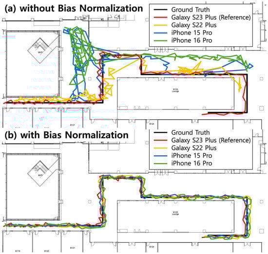 Figure 8 shows the real-time positioning test results for one test path. The black line represents the actual path, and the colored lines show the positioning results with various smartphone models. Figure 8a shows positioning results without bias normalization, where we used an LSTM model trained with original magnetic field vector sequences collected from the reference device (Galaxy S23 Plus). The reference device (red line) achieved an average positioning error of 0.60 m. Galaxy S22 Plus (orange line), which has a relatively smaller offset bias compared to other models (19.9 μT), achieved an average positioning error of 2.48 m without normalization. In contrast, iPhone 15 Pro (blue line) and iPhone 16 Pro (green line) showed severe degradation with average positioning errors of 18.21 m and 13.13 m, respectively, due to their larger offset biases (41.74 μT and 56.47 μT).
