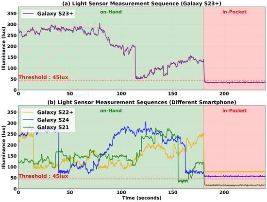 Figure 9a shows the light sensor measurements from the Galaxy S23 Plus while walking around in an indoor environment. The user held the smartphone in hand for 180 s and then placed it in a pocket. When held in hand, the light sensor measurements are approximately in the 55 to 310 Lux range. However, when placed in a pocket, the light sensor measurement was 38 Lux. To distinguish the smartphone position, we used a 45 Lux threshold.
