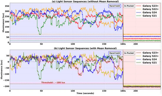 In contrast, Figure 10b shows the results after applying mean removal bias normalization. The mean values of light sensor measurements were 261 Lux, 296 Lux, 278 Lux, and 238 Lux for the Galaxy S23 Plus, Galaxy S22 Plus, Galaxy S24, and Galaxy S21, respectively. After subtracting these means from the measurements, the normalized values of all the models in the hand-held state ranged from −182 Lux to +70 Lux, while they ranged from −202 Lux to −178 Lux in the in-pocket state. A value of −180 Lux was selected as the threshold, since it can clearly distinguish the hand-held state from the in-pocket state. As a result, Figure 10b demonstrates that the mean removal effectively removes the offset biases from various models, enabling robust smartphone position detection with a single threshold.