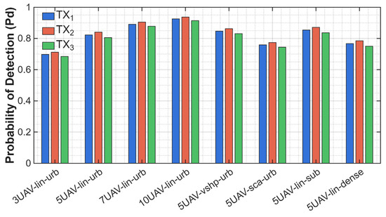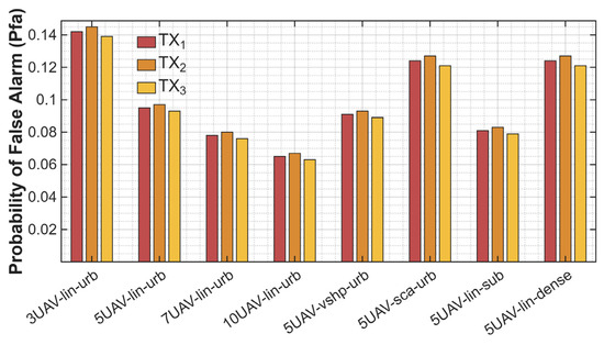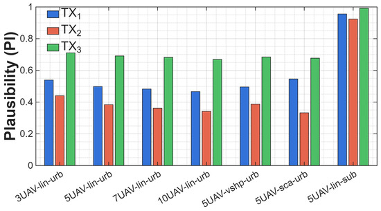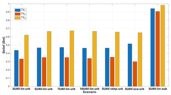 The belief function for each previously described scenario varies depending on the number of sensors, the environment, the formation, and the TX from which the signals are received. TX1 and TX2 were moving, while TX3 remained stationary throughout the simulation. As a result, we obtained higher belief function values for the stationary emitter. A UAV swarm moves toward a stationary target when movable emitters move away in different directions. Analyzing the obtained values, the same trend is observed as in the case of probability of detection and false alarm—an increase in the number of sensors yields higher belief function values. The influence of the chosen environment and formation also matters—it is clear that five UAVs in suburban terrain and flying in linear formation give better results than the same number of sensors in different environments and formations. To be more precise, the best case was five UAVs in a linear formation and working in suburban terrain. The belief function reached a value from 0.9 to 0.97, depending on the emitter type. The same number of sensors, but in an urban area and flying in scattered formation, had a lower belief function value—0.51 for the first moving emitter, 0.3 for the second one, and 0.67 for the stationary emitter. Another scenario yielded similar results, with a visibly higher belief function value for stationary emitters. What is worth noting is the minimal decrease in the belief function value when increasing from seven UAVs to ten UAVs—from 0.68 to 0.67. A larger number of sensors may lead to conflicts between individual elements, which lowers the final result.
