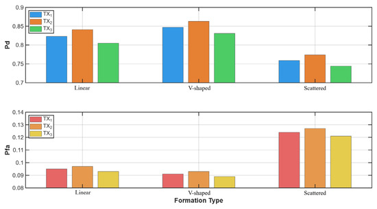Although the architecture is simulated, it is intended to reflect real-world conditions. Each UAV is assumed to transmit data from its sensors over a Wi-Fi-based channel to a ground-based data fusion center. MATLAB models this exchange using data structures representing asynchronous packet-based communication. Latency and packet loss models are included to assess the system’s robustness under degraded communication conditions. The data fusion center in the simulation is responsible for receiving data from all sensors, applying the selected data fusion algorithm, making the final decision on the presence of emitters, and generating the system performance characteristics. The fusion center is implemented in MATLAB. The simulation scenario assumes the deployment of various UAVs, each of which monitors a given frequency band in which the emitter may be located. The emitter signal is modeled as a narrowband transmission with time-varying SNR depending on the UAVs’ location, representing propagation and interference effects. The UAVs perform tasks according to a defined monitoring schedule and report results every 100 ms. The simulation includes the following: the movement of emitters, time-varying emitter activity, varying interference levels, and the mobility of the UAVs (UAVs change their height and position). The simulation setup consists of two mobile TXs and one static TX. The TXs move in opposite directions, moving away from each other and away from the static emitter. The starting location of the TX is randomly generated in each iteration, but it is approximately 1500 m in the x-axis from the point (0, 0) and 500 m in the y-axis. The sensors always move towards the TXs, despite changes in the TXs’ positions. Additionally, the sensor group moves in one of three proposed formations: scattered, V-shaped, and linear. Regarding the additional interference sources implemented, the main distinction is the simulation of various terrain and building models: urban, suburban, and dense urban. The radio noise levels were implemented in accordance with the International Telecommunication Union (ITU) recommendations—ITU-R P.372 [38]. In each iteration, the data fusion center collects data from the sensors and decides on the presence of the emitter. Then, the detection performance of the DST fusion method is compared. The simulation results, presented in the next section, show that such a system increases detection accuracy, reduces false alarms, and improves situational awareness in scenarios reflecting the real electromagnetic spectrum conditions during a realistic scenario for using telecommunications devices.