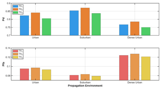 - Propagation conditions emerged as an important factor affecting system performance. In suburban environments with reduced multipath effects and signal attenuation, the system achieved detection probabilities of 0.86 with false alarm rates as low as 0.08. In dense urban scenarios, where significant signal reflections and interference occurred, the probability of detection decreased to 0.77, and the probability of false alarm decreased to 0.13. The DST metrics confirmed these trends—belief function values decreased from 0.81 in suburban to 0.72 in dense environments, while conflict coefficients increased from 0.08 to 0.14, indicating greater inconsistency between sensor observations in challenging propagation conditions.