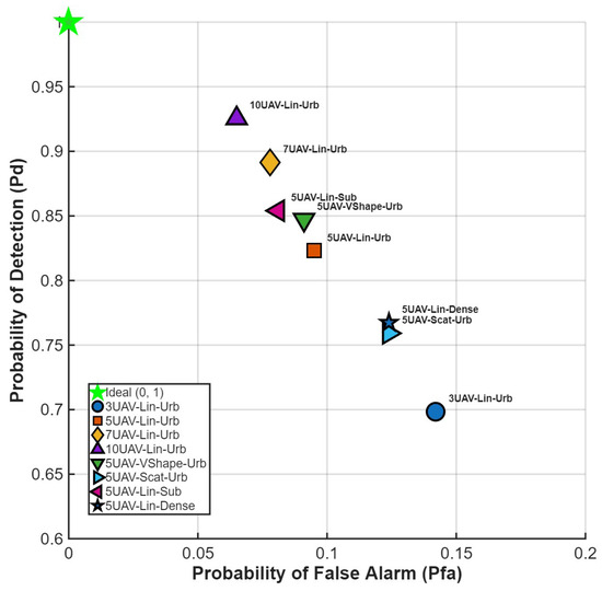 - UAV deployment formation demonstrated a substantial impact on monitoring effectiveness. The V-shaped formation outperformed linear and scattered configurations, achieving 0.85 detection probability with only 0.09 false alarm probability for five UAVs in urban terrain. This configuration provided optimal observation angles and spatial diversity, resulting in the lowest uncertainty (0.17) and conflict (0.09) values. Despite offering the widest spatial coverage, the scattered formation exhibited the poorest performance (0.76 detection probability, 0.13 false alarm probability) due to irregular sensor spacing that generated contradictory measurements and elevated conflict levels (0.14).