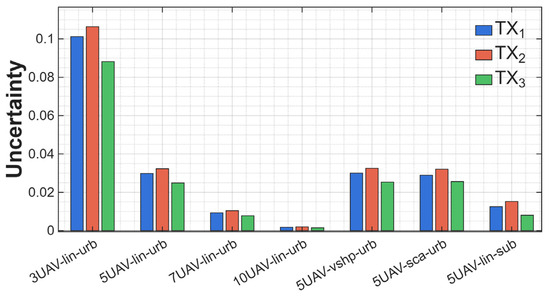 The obtained values are low, below 0.1 in each scenario, and the highest is for three UAVs in linear formation and urban terrain, from 0.8 to 0.11. The higher the value of the uncertainty function, the greater the difference between the belief and plausibility functions shown in the two previous graphs. It is clear that, for seven or ten UAVs in the same scenario, the uncertainty values are very low, below 0.01, which explains why the plausibility function values are almost equal to the belief function values. The decrease in uncertainty is due to the increased number of UAVs, leading to greater evidence consistency during the fusion process. Scenarios for five UAVs with the V-shaped and scattered formations are characterized by higher uncertainty than those for the linear formation, despite the identical number of drones. The influence of terrain may result from differences in spatial coverage and observation angles—irregular formations cause greater measurement discrepancies, translating into greater evidence conflict.
