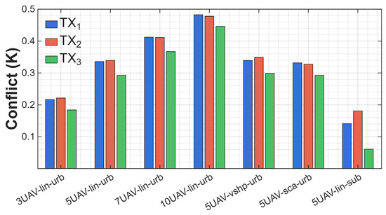 In a linear formation and urban terrain, the conflict value is approximately 0.2 for three UAVs, while for ten UAVs, it reaches a maximum of ~0.47. This indicates that increasing the number of sensors in a fixed-geometry system leads to greater discrepancies in the evidence masses, i.e., increased information conflict between sensors. For scenarios with five UAVs, the impact of deployment and flight geometry on the conflict value is noticeable: the V-shaped and scattered formations exhibit moderate conflict levels (~0.35), suggesting that diverse observation angles and greater spatial coverage in nonlinear systems (V-shape, scattered) may partially compensate for the mutual measurement inconsistencies and reduce conflict. Comparison of the urban and suburban scenarios for five UAVs reveals a significant decrease in conflict in the suburban environment—in the urban environment, K ≈ 0.35, and in the suburban environment, K < 0.2. This means that in a less noisy radio environment, sensors record more consistent data, thereby reducing conflict levels in the DST fusion process.