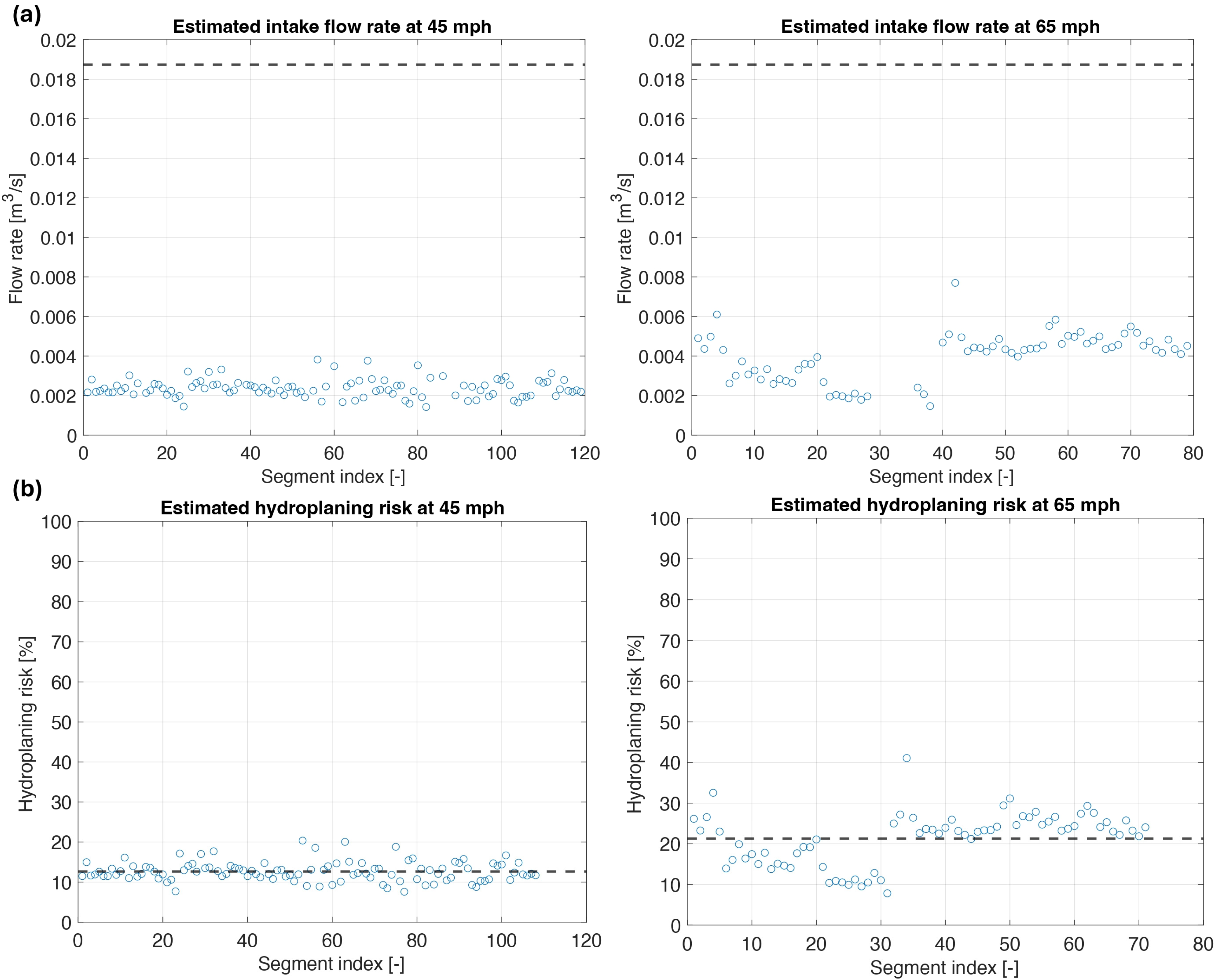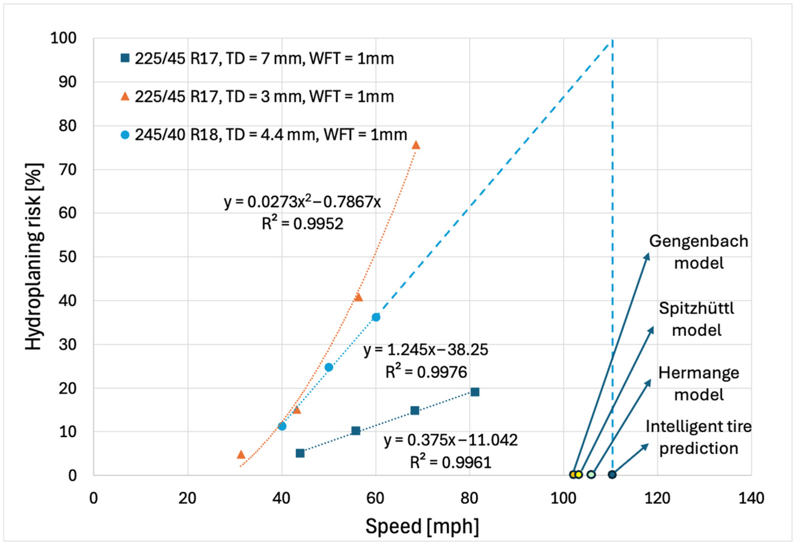 Using the intelligent tire system in controlled water depth conditions, three hydroplaning risk points were measured and analyzed at 40 mph (64.4 km/h), 50 mph (80.5 km/h), and 60 mph (96.6 km/h), following the procedure described in