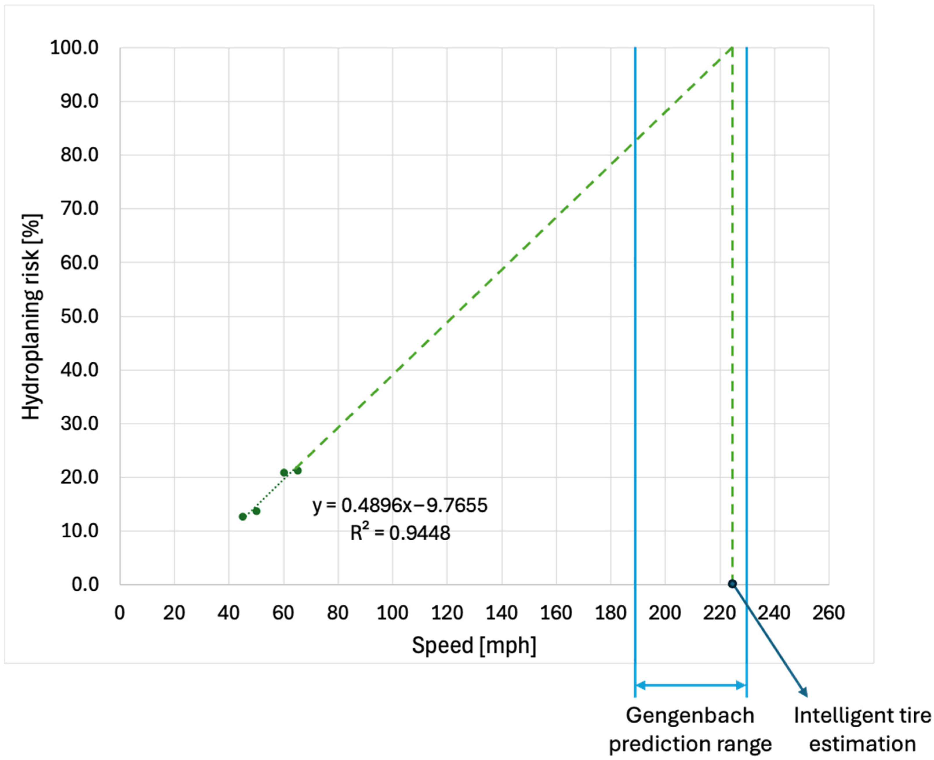 For an inflation pressure of 280 kPa (2.8 bar) and assuming the same water absorption capability of 1.47, this model predicts a critical hydroplaning speed of 103 mph (165.8 km/h). The calculated value further supports the accuracy of the intelligent tire system predictions and the proposed hydroplaning risk estimation methodology.