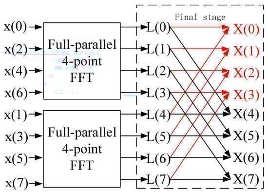 where and denote the time-domain and frequency-domain sequences, respectively, and is the twiddle factor. Derived from Equation (1), Figure 1 illustrates the implementation of a full-parallel 8-point FFT based on the Radix-2 architecture. The full-parallel 8-point FFT structure is constructed by decomposing it into two 4-point FFTs. This is achieved by reordering the input sequence and performing a final butterfly operation at the final stage.