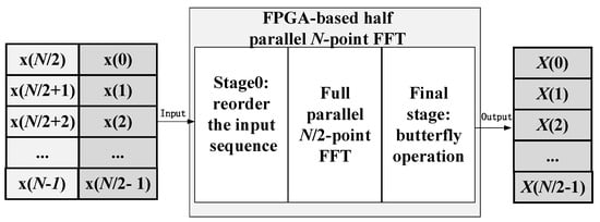 Therefore, the implementation scheme for the half-parallel N-point FFT, with an input parallelism of , is depicted in Figure 2. The proposed FPGA-based half-parallel N -point FFT architecture comprises three primary processing modules. The first module (Stage 0) reorders the input sequence into a bit-reversed order to facilitate the correct natural-order output of the final N-point FFT. The second module performs the full-parallel -point FFT calculation, which, as established in our prior work [], operates without using block memory. The third and final module carries out the butterfly calculations, highlighted by the red lines in Figure 1, to generate the N output points. Critically, as evidenced by the dataflow in Figure 1, the reordering processing essential for the half-parallel N-point FFT is implemented using only FPGA slice register (SR) resources, entirely avoiding the use of block memory. The detailed FPGA implementation is discussed in Section 3.