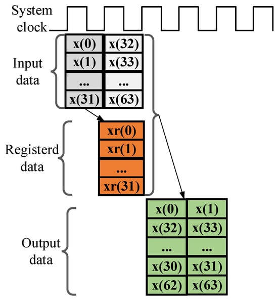 The FPGA implementation for generating the required output order is depicted in the schematic of Figure 4. The first 32 samples for the input of the 32-parallel 64-point FFT are initially stored in an internal register array . These temporarily stored samples are then interleaved with the subsequent 32 input samples to produce the correctly ordered sequence for the next stage of FFT computation.