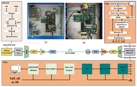 To validate the proposed energy-efficient FFT scheme and system-level solution, a real-time IMDD OFDM-PON platform is implemented using two Xilinx ML605 FPGA boards, as shown in Figure 7. The key system parameters are summarized in Table 2 which are also used in the paper [].
