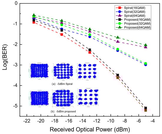 The BER performance against the optical received optical power. (a) The constellation diagrams for Spiral; (b) The constellation diagrams for this paper.