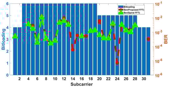 To assess the system performance under realistic operating conditions, in which adaptive modulation format is always employed to compensate for varying received optical power and system frequency roll-off, the BER of both the Spiral FFT and the proposed FFT is evaluated using an adaptive modulation scheme at a received optical power of −5 dBm. As shown in Figure 9, the proposed FFT and the Spiral FFT achieve nearly identical BER performance under adaptive modulation.