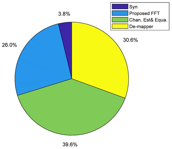 To evaluate the energy efficiency of the proposed FFT, the 16-bit quantized Spiral FFT serves as the power consumption baseline. The power consumption of both the Spiral FFT and the proposed FFT is measured under various modulation formats (64-QAM, 32-QAM, 16-QAM, and adaptive) across a wide range of received optical powers (−5, −9, −13, −17, and −21 dBm) typical in PON systems. The results, summarized in Figure 10, lead to two key findings. Firstly, the modulation format has a negligible impact on the power consumption of either FFT implementation. Secondly, the energy savings of the proposed FFT increase as the received optical power decreases, reaching 66.5% at −5 dBm and 76.1% at −21 dBm. This trend is a direct consequence of the dynamic bit-resolution scaling in the proposed FFT, which reduces computational precision at lower ROP levels. The average energy saving across all tested conditions is approximately 70%. Leveraging the DSP module power breakdown for the ML605-based receiver [], Figure 11 illustrates the updated power distribution when the proposed FFT is employed at an ROP of −21 dBm. A key outcome is evident: the FFT module is no longer the dominant consumer power within the FPGA-based real-time IMDD OFDM-PON receiver.