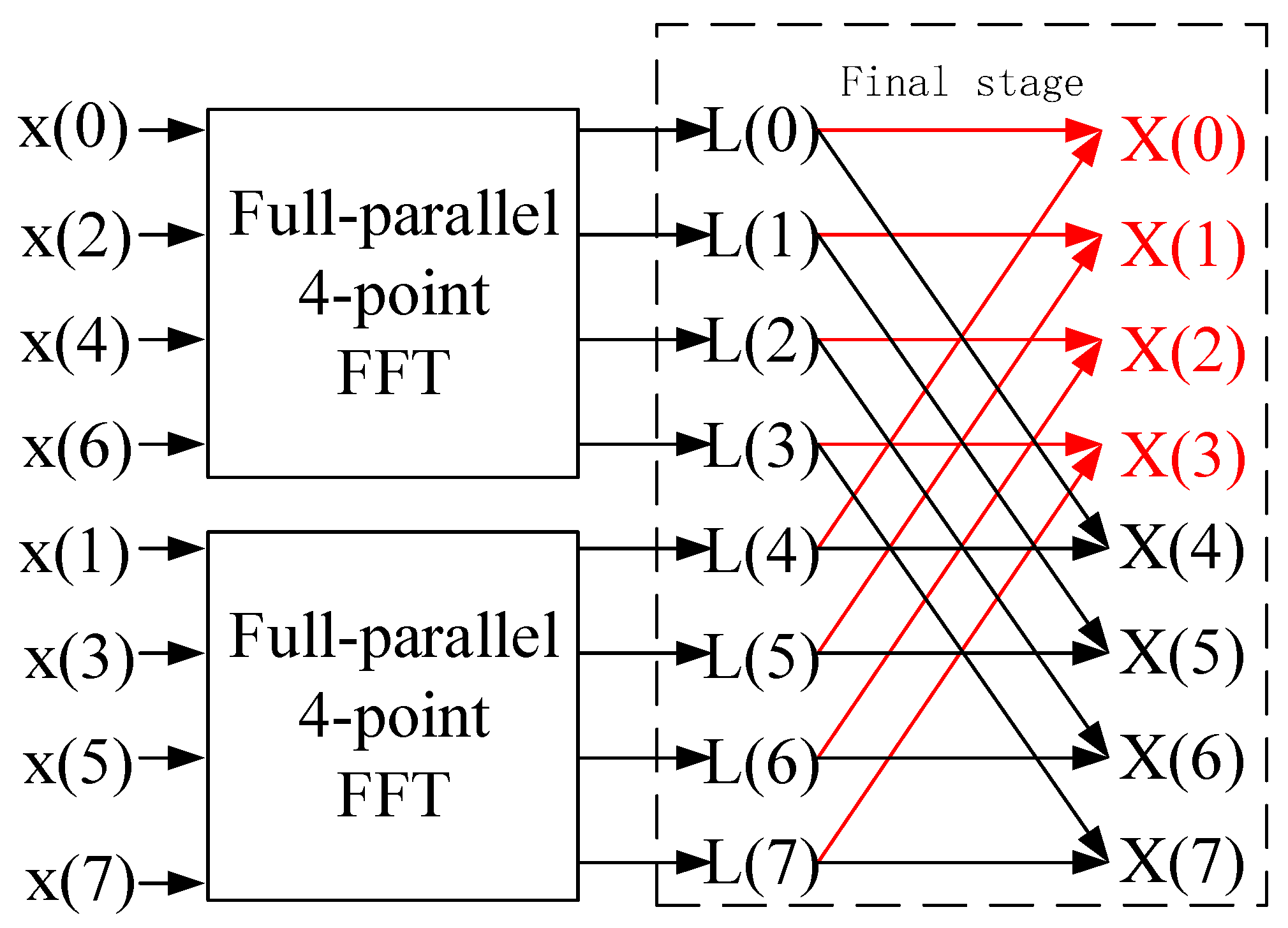 - Zhang, J.J.; Wang, W.L.; Giddings, R.P.; Zhang, Q.W.; Peng, J.J.; Chen, J.; Tang, J.M. Analytical Solution of Stage-Dependent Bit Resolution of Full Parallel Variable Point FFTs for Real-Time DSP Implementation. J. Light. Technol. 2018, 36, 5177–5187. [Google Scholar] [CrossRef]
