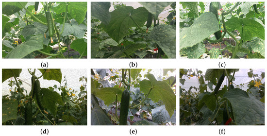 Diverse cucumber samples. (a) The cucumber with one side is obstructed. (b) The cucumber heavily shaded in the middle. (c) The cucumber with a large amount of missing information. (d) Many cucumber targets. (e) The cucumber located at the edge of FOV (field of view). (f) Cucumbers with low-level lighting.