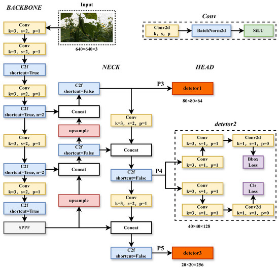 Deep learning has emerged as the mainstream paradigm for object detection, which can be categorized into two-stage detectors and one-stage detectors. Represented by R-CNN [6], two-stage object detectors encompass variants such as PV-RCNN [7], Sparse R-CNN [8], and other related models [9,10,11]. While these detectors deliver high accuracy, they demand substantial computational resources primarily due to the candidate region generation step. One-stage detectors like YOLO series address this trade-off, achieving better balance between speed and accuracy. YOLOv8_n [12], as a lightweight variant, is suitable for edge deployment but still has shortcomings in complex cucumber detection scenarios: its C2f module lacks effective multi-scale feature fusion, leading to suboptimal performance on occluded or small targets; the original detection head is redundant in parameters; and standard convolutions fail to balance parameter efficiency and feature representation. In this paper, we propose a lightweight cucumber detection model based on YOLOv8_n structure. The main innovations include: