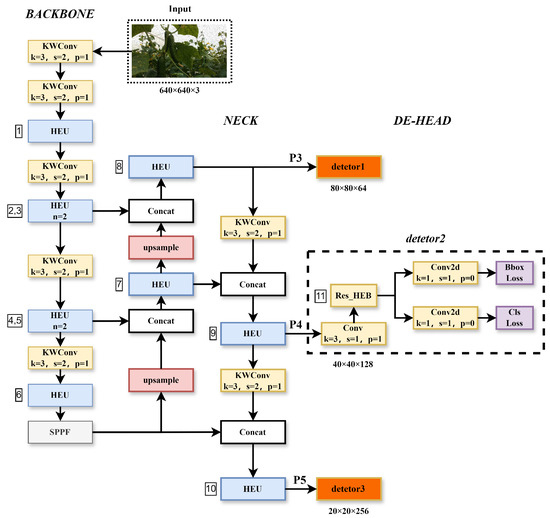 In complex natural environments, YOLOv8_n performs poorly in recognizing cucumbers. Based on YOLOv8_n, the LMS-Res-YOLO model has been developed, which is a lightweight and efficient cucumber object detection model that excels at accurately identifying cucumbers in near-colored backgrounds. LMS-Res-YOLO’s multi-layered network structure captures more detail in the input data by utilizing multiple layers of feature extractors. Figure 3 illustrates the network structure of the LMS-Res-YOLO model, and the main improvements over our proposed LMS-Res-YOLO include: (1) To replace the C2f with the HEU (High-Efficiency Unit with residual blocks) to enhance the multi-scale representation ability of features, improve the nonlinear modeling ability of the network for complex problems, and reduce information loss during network transmission. (2) To replace the detection head with the DE-HEAD (Decoupled and Efficient detection HEAD with the fusion of multi-scale features) in order to further reduce the model’s size without affecting its performance. (3) To replace the Conv of the backbone and neck with the KWConv (KernelWarehouse) [27], which was proposed by Intel in 2023. It can reduce the model’s size and better balance the relationship between parameter efficiency and representation ability.