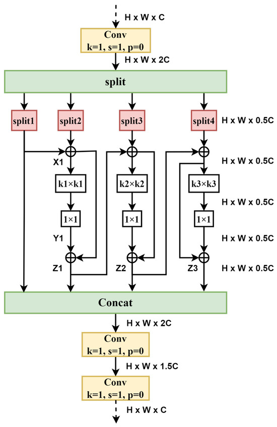 The C2f module has some shortcomings, such as its large number of parameters and high computational complexity. The newly designed HEU is more lightweight and has further improved performance. After replacing C2f with HEU alone, there is a slight improvement in mAP@0.5, and mAP@0.5:0.95 increases by 1%, which is very commendable. The HEU structure is shown in Figure 4. It is made up of the Conv, Split, Res_HEB (High-Efficiency Block with Residual blocks), and Concat modules. In Figure 5, the Res_HEB block takes full advantage of the multi-scale representation fusion, which can make models achieve invariance to scale changes. In practice, an object’s scale may change due to factors such as distance, viewing angle, or image resolution. By extracting features at different scales, the model can better adapt to objects of different sizes, leading to increased accuracy and stability. Feature fusion techniques frequently utilize multiscale representations to obtain more global and comprehensive feature representations [28,29]. For Res_HEB, the input feature maps have dimensions of . After the transition via a convolution, the dimension of the output feature maps becomes . Next, the output is divided into four parts in the channel dimension, which are denoted as split 1, split 2, split 3, and split 4. Subsequently, split 1 and split 2 execute the element-wise tensor addition operation, creating a new tensor known as X1, which maintains the same shape. X1 then undergoes depth-wise separable convolution with a kernel size of k1 while keeping the same input and output channel numbers. This process efficiently extracts features from multi-channels, preserves spatial information, requires few parameters, and maintains the number of channels unchanged. Z1 emerges from the element-wise tensor addition between X1 and Y1. This operation belongs to residual connections [30], which is crucial to our model, and experimental results show that our model cannot converge during training without it. Then, Z1 undergoes element-wise tensor addition with split 3. Following the same process as above, Z2 and Z3 are obtained. These feature maps from split1, Z1, Z2, and Z3 are concatenated as input to two convolutions to further obtain the cross-channel feature information.