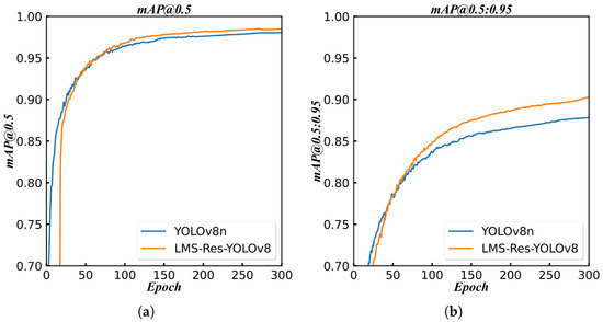 Training curve of mAP on YOLOv8_n and LMS-Res-YOLO. (a) Training curve of mAP@0.5. (b) Training curve of mAP@0.5:0.95.