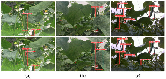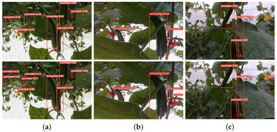 Comparison of detection results on small cucumbers between YOLOv8_n and LMS-Res-YOLO. The first row shows the detection results of YOLOv8_n, and the second row shows the detection results of LMS-Res-YOLO. (a) Small cucumbers at the edge of FOV and occluded small cucumbers. (b) Occluded small cucumbers. (c) Small cucumbers at the edge of FOV.