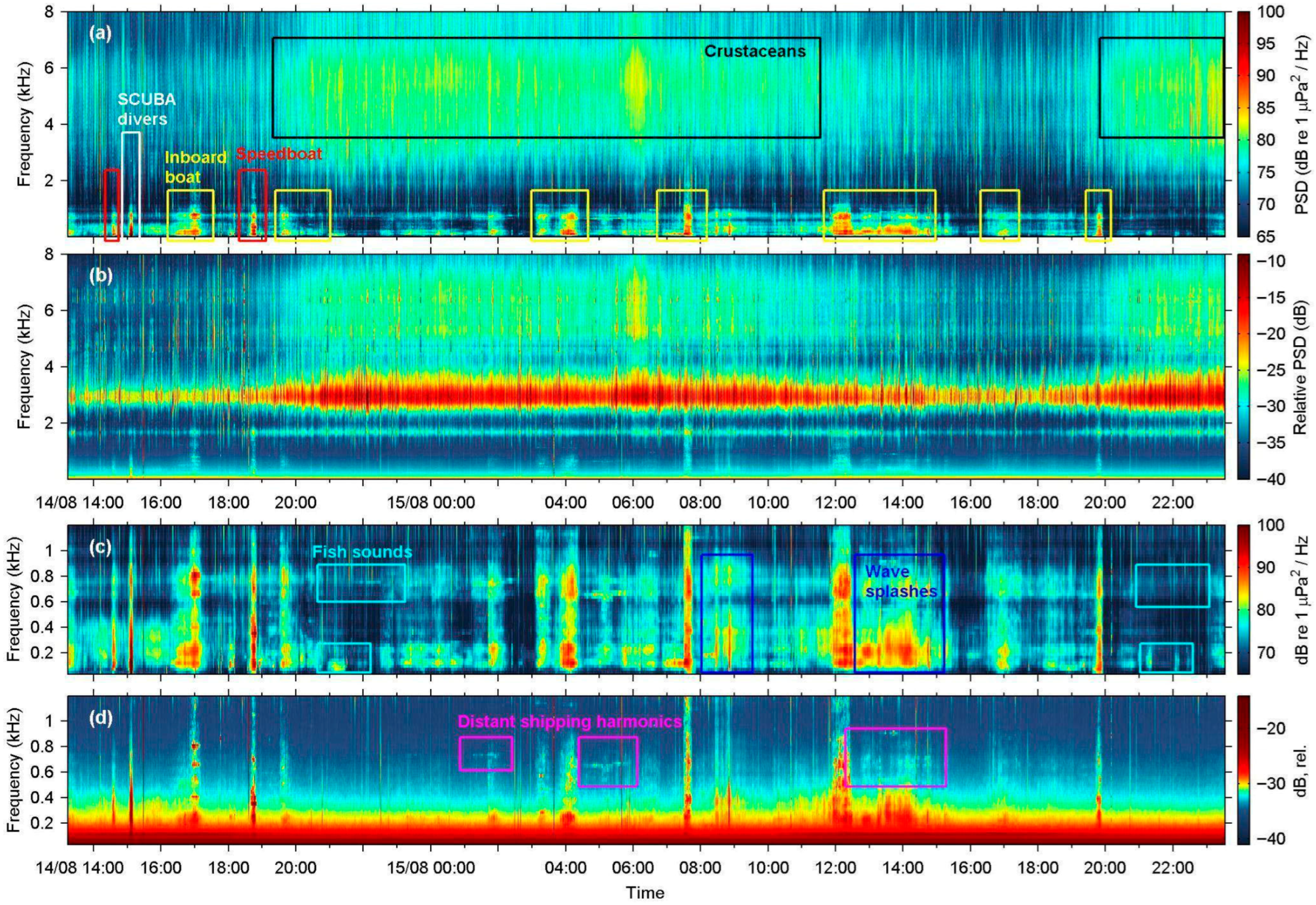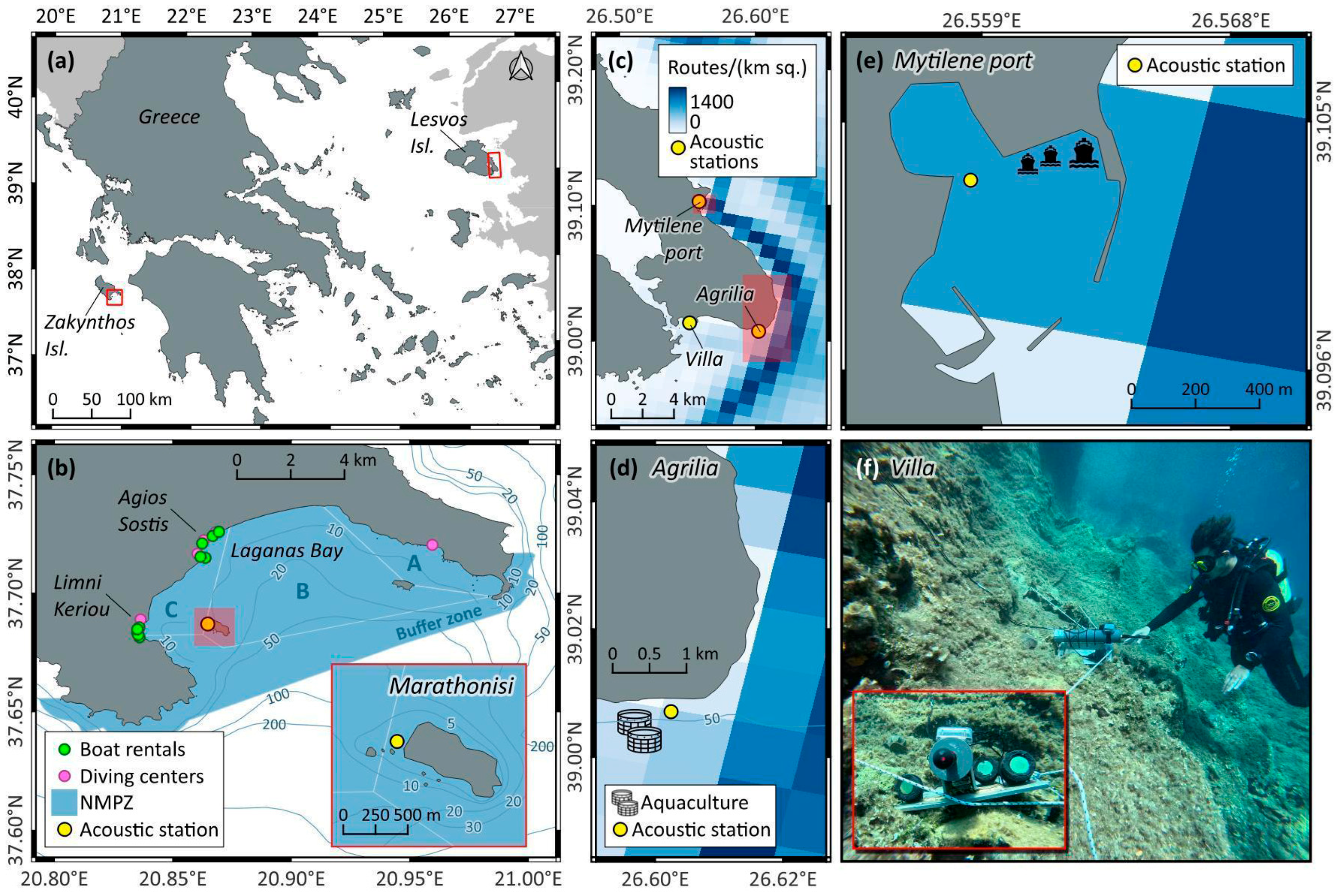 - La Manna, G.; Picciulin, M.; Crobu, A.; Perretti, F.; Ronchetti, F.; Manghi, M.; Ruiu, A.; Ceccherelli, G. Marine soundscape and fish biophony of a Mediterranean marine protected area. PeerJ 2021, 9, e12551. [Google Scholar] [CrossRef]
