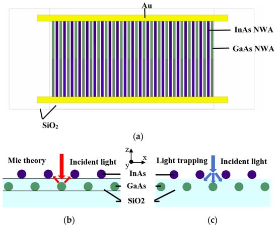 Figure 1a shows a schematic diagram of the integrated device based on stacked LNWAs. A SiO2 substrate with a thickness of 0.5 μm along the z-direction and a width of 6.5 μm along the y-direction is used at the bottom. A row of GaAs LNWA lying on the substrate serves as the solar cell, with a NW length of 5 μm consisting of a p-region length of 2.5 μm with a doping concentration of 2 × 1019 cm−3, and an n-region length of 2.5 μm with a doping concentration of 1 × 1018 cm−3. SiO2 is used as the cover layer encapsulating the GaAs LNWA. The InAs LNWA photodetector on the SiO2 cover layer has the same period as the lower-layer GaAs LNWA and is staggered arranged. The InAs LNWA has the same length, p–n junction structure, and doping level as the GaAs LNWA. The gap between two layers of LNWA is 0.1 μm. Both ends of the two layers of LNWA are connected in parallel using Au as electrodes and are connected outside the cover layer. This structure reduces the spatial absorption competition of incident light by staggered arrangement of two layers of LNWA. In addition, the two layers of LNWA reinforce each other through Mie scattering and light trapping, as shown in Figure 1b and c, respectively.