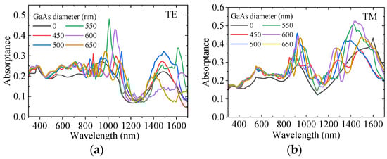 Figure 8 shows the variation of absorption of GaAs LNWA with period. The InAs LNWA diameter is set to 400 nm and GaAs LNWA diameter is set to 500 nm. From Figure 8a,b, it can be observed that with the increase of the period, the absorption of TE and TM polarizations exhibits a redshift. Moreover, the absorption peak of GaAs LNWA increases continuously with the increase of period, regardless of TE or TM polarization. However, when the period continues to increase (longer than 1300 nm at this parameter), the absorption peak decreases with the increase of the period. This indicates the competitive interaction between the light shielding and light trapping effect of the upper-layer InAs LNWA, which jointly affects the light absorption of the lower-layer GaAs LNWA. Reasonable design of structural parameters can minimize the reduction in absorption caused by shielding and leverage the light trapping effect to enhance the absorption.