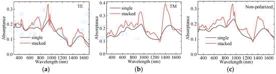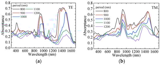 To facilitate the subsequent optimization of integrated device parameters, the influence of period variation on the absorption of the upper-layer InAs LNWA are further studied. The InAs diameter is fixed at 300 nm, the GaAs diameter is set to 500 nm, and the period of the upper and lower LNWAs is scanned from 800 to 1200 nm. It can be seen from Figure 5 that, for both TE and TM polarizations, the absorption of InAs continuously decreases as the period increases. This is attributed to the reduced filling rate of the LNWA caused by the increased period, which leads to less light–matter interaction and weaker light-trapping capability, resulting in reduced absorption.