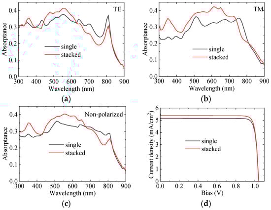 Figure 11 shows the absorption and I–V curves of GaAs LNWA before and after integration. For TE polarization, before the wavelength of 630 nm, the absorption of the integrated device has been improved, as shown in Figure 11a. For TM polarization, this improved range is increased to 740 nm wavelength, as shown in Figure 11b. For the non-polarized case, the absorption is enhanced before the wavelength of 670 nm, as shown in Figure 11c. If the period of LNWA array is increased, the overall enhancement of GaAs at the wavelength of 300–900 nm can be realized, but the absorption of InAs will be sacrificed. As shown in Figure 11d, although the absorption around the wavelength of 750 nm has decreased, the overall short-circuit current density has increased from 5.16 mA/cm2 to 5.38 mA/cm2, and the conversion efficiency has therefore increased from 4.73% to 4.94%.