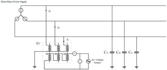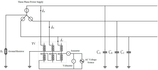 As shown in Figure 1, the three-phase secondary windings form an open delta terminal. The turns ratio of the VT is k (k = n1:n2, where n1 and n2 are the numbers of windings of the primary and secondary windings, respectively). It is assumed that phases A, B, and C are symmetric, and the capacitance to ground of each phase is set as C. A current i0 with a constant magnitude (effective value) is injected into the open delta side of the VT, and i1, i2, and i3 are the excitation currents of the voltage transformer, while ia, ib, and ic are the currents obtained by converting i0 to the primary side. Then