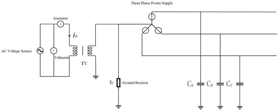 Figure 7 shows a power grid with neutral grounded via high resistance. A voltage signal is injected into the neutral point of the power grid through a single-phase voltage transformer, and a corresponding induced current will be induced on the VT primary side. The equivalent circuit of the primary side for the injected signal is the same as that in Figure 8. If the three-phase capacitances , the equivalent circuit is as follows: