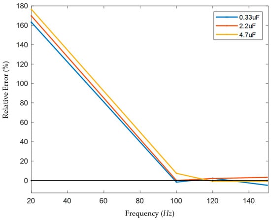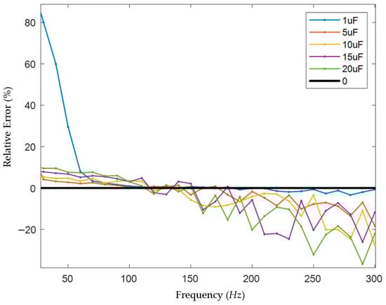 It can be found from the measurement results that the high–low frequency combination method can accurately measure the large system’s capacitance to ground under the appropriate frequency scheme. When the low frequency is selected in the range of 100–150 Hz, the error can be kept within 10%. When the low frequency is selected as 20 Hz, the measured capacitance values are all larger than the actual values.