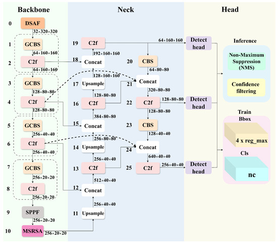 Network architecture of YOLO-DMF. GCBS denotes Group Convolution, Batch Normalization, and SiLU activation function.
