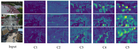 In UAV-based object detection tasks, challenges such as long imaging distances, high-speed motion, and low-altitude flight often lead to motion blur, which results in small-sized targets with poor feature distinguishability, thereby degrading training efficiency and detection accuracy. Particularly when the UAV operates at higher altitudes, tiny objects in the captured images are prone to missed detection due to their extremely small scale. Although the original YOLOv8 architecture incorporates multi-scale feature maps (, , and ) to detect small- and medium-sized objects, it still exhibits limited capability in extracting discriminative features for tiny objects commonly encountered in UAV imagery. As the network depth increases, the resolution of deep convolutional feature maps progressively decreases. The coarse-grained semantic information in these layers contains a large amount of redundant data, causing fine-grained details of tiny targets to be gradually suppressed during the feature abstraction process (as illustrated in stages C4 and C5 in Figure 4). Consequently, such targets become indistinguishable from background noise, significantly degrading the model’s ability to perceive small objects. This fundamental limitation substantially compromises YOLOv8’s performance on drone-captured datasets where tiny objects predominate.
