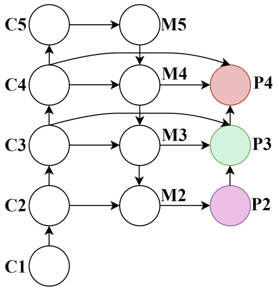 FPRRN network schematic. Here, C denotes the backbone feature maps, M represents the merged features after fusion in the neck, and P indicates the predictive features used for multi-scale detection.