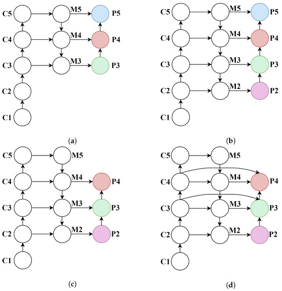 To validate the effectiveness of the proposed FPRFN in multi-scale feature fusion, we conducted comparative experiments using various feature fusion strategies. The experiments primarily focused on replacing the high-level feature layer P5 (as shown in Figure 6a), originally used for large object detection, with the shallow feature layer P2 (as shown in Figure 6b,c), which is more suitable for small object detection. In addition, different multi-scale feature fusion architectures, including PAN and the proposed FPRFN (as shown in Figure 6d), were evaluated. All experiments were tested and evaluated on the VisDrone2019 test dataset with the relevant results summarized in Table 7 and Table 8.