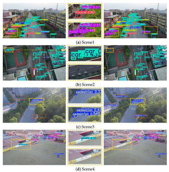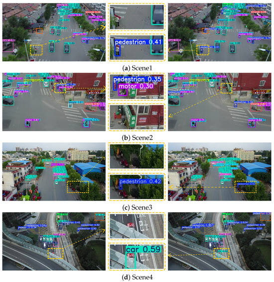 As shown in Figure 9, in Scenario 1, two pedestrians at the end of a zebra crossing were not detected by YOLOv8s. In Scenario 2, objects placed in front of a store entrance were falsely identified as a pedestrian and a motorcycle by YOLOv8s. In contrast, in Scenario 3, despite partial occlusion caused by tree shade, YOLO-DMF successfully detected the pedestrian and accurately recognized the truck at the urban intersection. In Scenario 4, YOLO-DMF achieved a more precise localization of an occluded car beneath elevated structures while maintaining a low false positive rate in distant background regions such as flower beds. Overall, these experimental results indicate that YOLO-DMF exhibits significant advantages over YOLOv8s in detecting small objects under complex conditions involving occlusions.