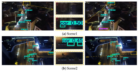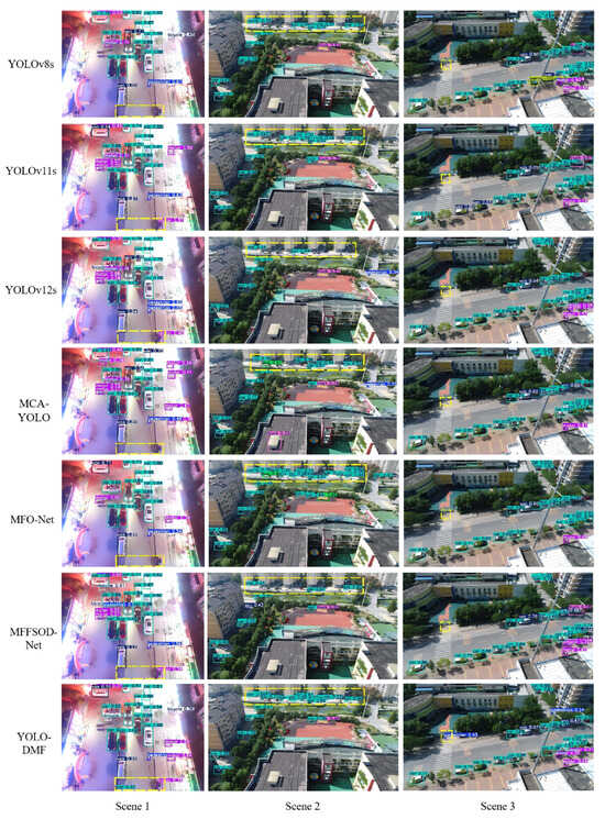 To further validate the model performance, we compared the visual detection results of YOLO-DMF with those of several state-of-the-art algorithms under challenging scenarios, including dense scenes in both daytime and nighttime conditions, as well as scenes containing tiny objects, as illustrated in Figure 12. Although YOLO-DMF achieved significantly improved detection accuracy on the VisDrone2019 dataset and effectively addressed most existing detection challenges, it still faces certain limitations in practical applications due to the inherent difficulty of detecting small objects in drone-captured imagery. As shown in Figure 13, YOLO-DMF still suffers from varying degrees of false positives and missed detections in complex scenarios.