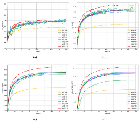 To verify the fast convergence and high convergence accuracy of the YOLO-DMF model, we conducted a comprehensive comparative analysis between YOLO-DMF and several lightweight object detection models on the VisDrone2019 dataset. The complete comparison results are presented in Figure 11. As shown in Figure 11, YOLO-DMF demonstrates significant advantages in network convergence speed, achieving higher accuracy in fewer training epochs compared to other models. Furthermore, YOLO-DMF shows notable performance improvements across all evaluation metrics. Detailed experimental results are presented in Table 12.